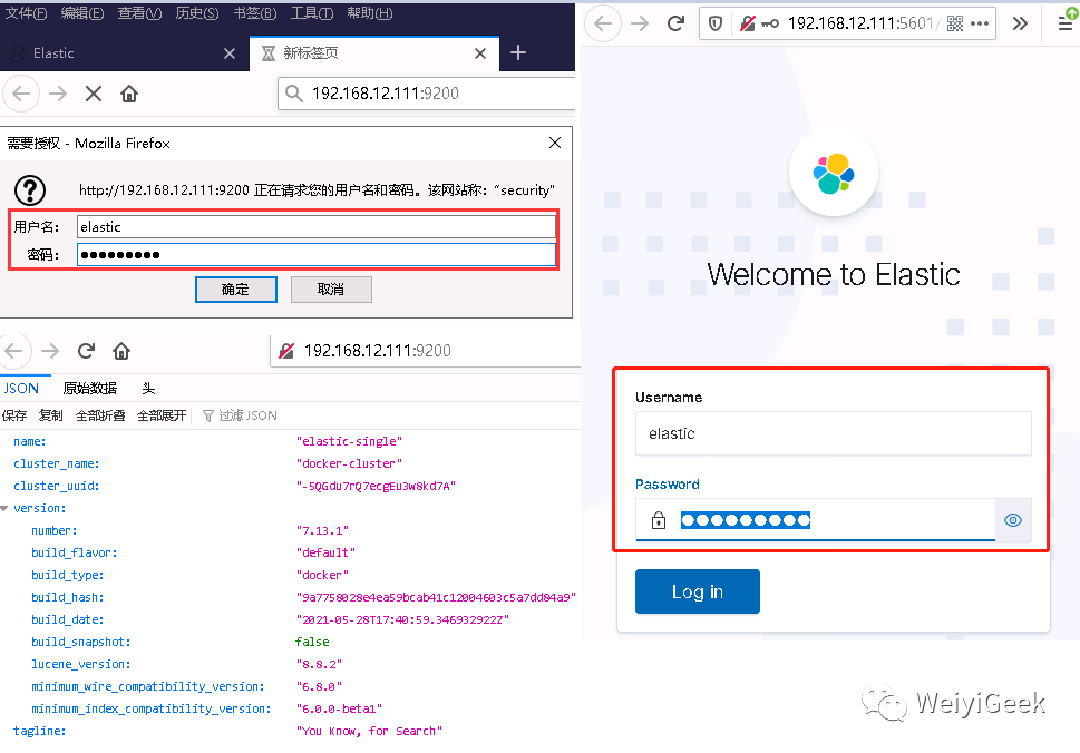 $ docker exec -it elastic bash[root@9f90fe28213c elasticsearch]# bin/elasticsearch-setup-passwords interactiveInitiating the setup of passwords for reserved users elastic,apm_system,kibana,kibana_system,logstash_system,beats_system,remote_monitoring_user.You will be prompted to enter passwords as the process progresses.Please confirm that you would like to continue [y/N]yEnter password for [elastic]: # weiyigeek 此处测试我们全部设置为相同的Reenter password for [elastic]:.....Enter password for [remote_monitoring_user]:Reenter password for [remote_monitoring_user]:Changed password for user [apm_system].....Changed password for user [elastic]