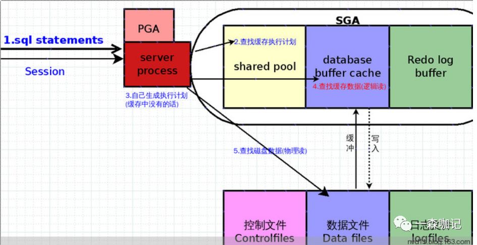 但是server process是不是就直接去访问数据文件呢?因为计算机的时间消耗主要都在物理IO,所以要尽量避免物理读写,SGA里面的database buffer cache起作用。即,database buffer cache就是用来缓冲Data files里的数据。可避免对数据文件的读写(物理读)。