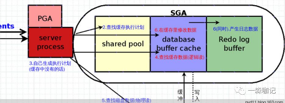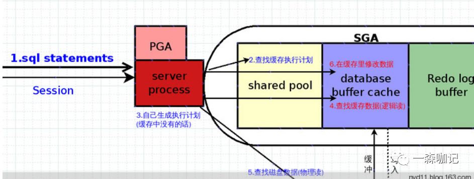 6. 逻辑读,物理读与缓存命中率. 由上图得知,所谓逻辑读,就是从缓存(一般是内存)里读取数据。而物理读,也就是从磁盘(数据文件)里读取数据。 至于缓存命中率,就是取出数据的过程中逻辑读次数/ (逻辑读次数+物理读次数) 这个比率. 当然这个比率越接近1越好, 因为物理读相当费时间,机械硬盘瓶颈,除非有服务器用SSD做硬盘。当然命中率并不是数据库健康的唯一指标,因当逻辑读十分巨大时,即使物理读很大,比率也会接近1,所以也需要关心每秒物理读(tps);可在linux下使用iostat命令来查看当前磁盘的每秒物理读。7. 在缓存中修改数据server process拿出数据放入缓存中,接下来就对数据进行修改。因修改数据会产生大量缓冲数据,所以这个动作在Database buffer cache里完成。
