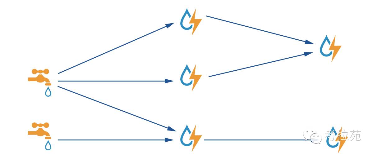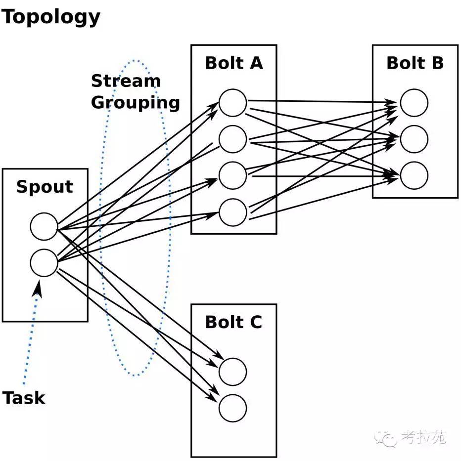 下面是一个Topology内部Spout和Bolt之间的数据流关系: