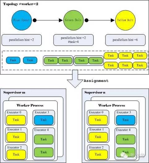 下图给出了一个简单的例子,上半部分描述的是Topology结构及相关说明,其中定义了整个Topology的worker=2,DAG关系,各个计算组件的并行度;下半部分描述了Topology的Task在Supervisor节点的分布情况。从中可以看出Topology到Executor之间的关系。