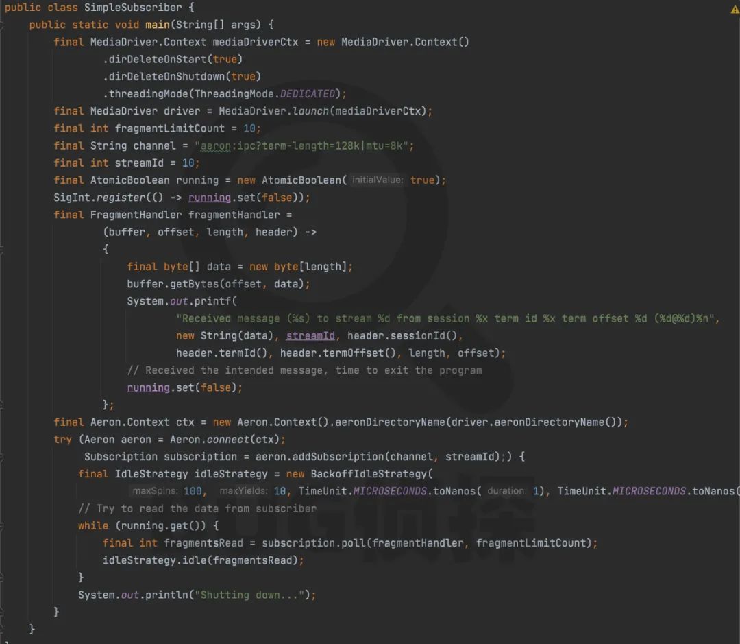 Subscriptions 用来接收消息,通过 addSubscription 来创建一个针对于指定 channel 和 stream 的 subscription,然后还需要提供一个实现了 FragmentHandler 接口的对象来处理接收到的消息。