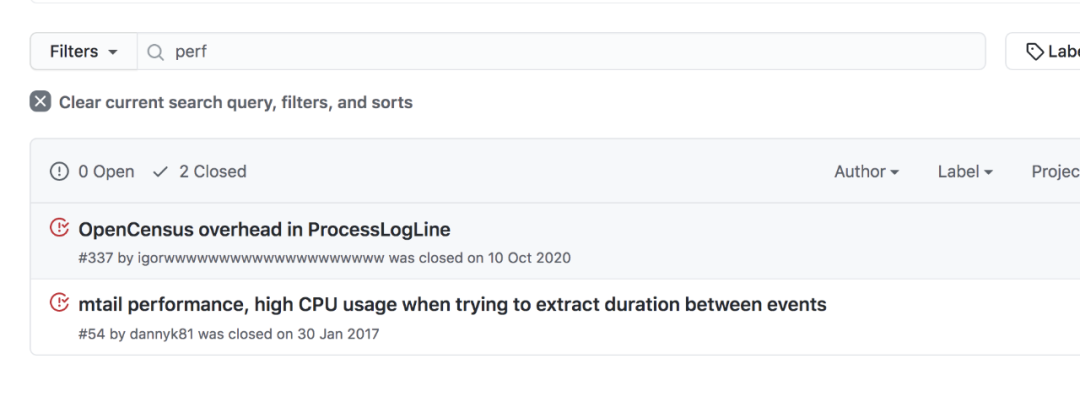 妥妥的性能问题,没别的说的赶紧解决吧。首先比较容易想到的就是从程序启动参数上进行优化,可是go不像java那样有丰富的启动参数(有不对的地方请评论区指正),在网上搜到一些参数设置了也是没啥效果。尝试用master分支的代码 build 了下,结果还是将近3分钟,在测试误差范围以内。在Mtail的github的仓库里翻了翻issue列表,最近一次提的性能相关的issue还是17年的。。。