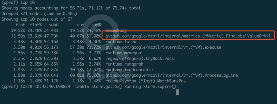 没别的好办法只能自己上了,尝试着使用Go自带的性能分析工具 pprof 生成一下最近60秒运行的报告,执行top10 命令,发现其中一个Mtail的方法的耗时比较可疑,根据方法名字看应该是和查找监控对象相关的,累计调用耗时占到了50%多,很有可能是晚高峰监控对象增多而该方法执行效率不太高最终出现性能问题了。