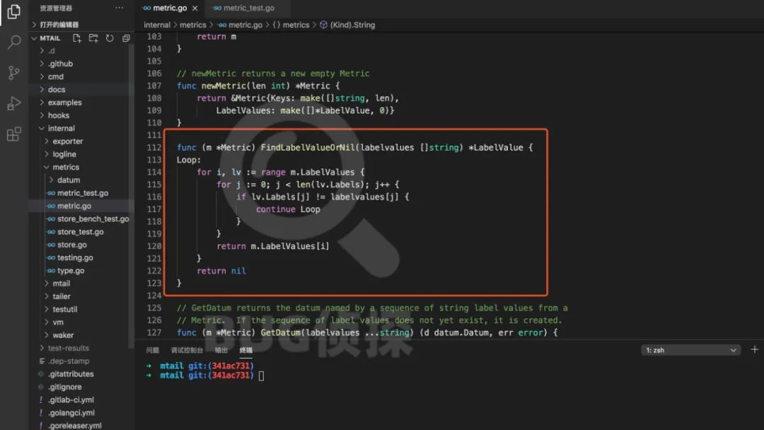 为了印证想法从git上把Mtail的源码拉下来简单扫了几眼,不得不说Google开源的项目结构还是很工整的,代码的模块化做的很好,比较容易的就理清了程序的运行逻辑,很典型的生产者消费者模型。在定位到相关代码后我更加坚信了自己的想法:果然是写出了个 O(M*N)复杂度的查询!!!按照它的实现逻辑,查找性能是与监控对象个数和监控对象维度成反比的,如果晚高峰监控对象比白天的时候多一倍,那么查询性能就弱一倍!