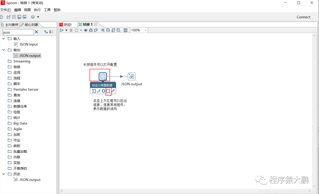 4. 找到JSON输出组件,拖拽该组件到创建的转换TAB页内,长按前面添加的常量组件,将常量组件连接至JSON输出组件上。