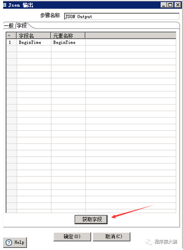 6. 编辑JSON输出组件,点击【字段】选项,点击下方的【获取字段】按钮获取之前自定义常量数据中设置好的字段信息。