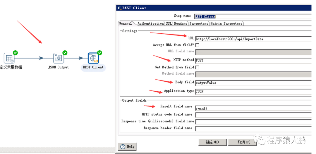 8. 双击REST Client步骤配置http请求服务,URL为部署在Web服务器上的站点地址,HTTP Method则不用多说了吧~