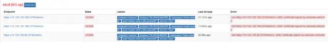访问prometheus的target能够看到etcd是down的状态,因为证书信任的问题。