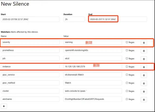 将silence时间修改为10年,因为我有三个etcd节点,所以要删除instance和告警级别,使用其他匹配项就能匹配到三个etcd节点了。