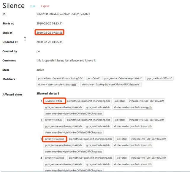 https://access.redhat.com/solutions/3358691这个bug要升级openshift才行,这个操作就很大了,所以只能找个workaround的方法,直接将该告警进行silence忽略。
