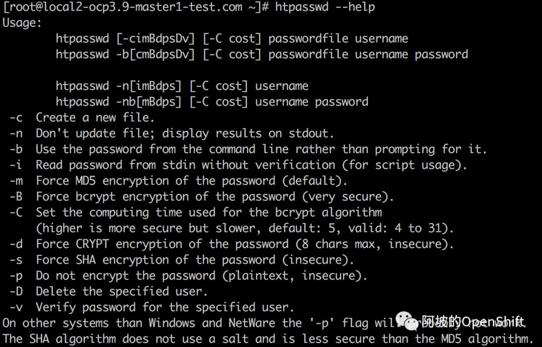 htpasswd是openshift默认的一种简单的用户密码管理工具,本文将介绍在openshift上常用htpasswd命令参数;openshift引用的htpasswd文件路径为:/etc/origin/master/htpasswd。