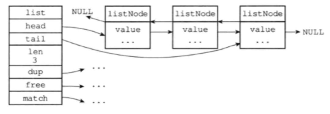 typedef struct listNode {struct listNode *prev;struct listNode *next;void *value;} listNode;typedef struct list {listNode *head;listNode *tail;unsigned long len;void *(dup)(void *ptr); 节点复制函数void (*free)(void *ptr); / 节点释放函数int (*match)(void *ptr, void *key); // 节点值对比函数} list;