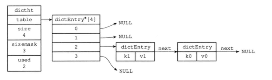 typedef struct dictht {// 哈希表数组dictEntry **table;// 哈希表大小unsigned long size;// 哈希表大小掩码,用于计算索引值,总是等于size - 1unsigned long sizemask;// 该哈希表已有节点的数量unsigned long used;} dictht;typedef struct dictEntry {void *key; // 键// 值union {void *val;uint64_t u64;int64_t s64;} v;// 指向下个哈希表节点,形成链表。一次解决键冲突的问题struct dictEntry *next;}typedef struct dict {dictType *type; // 类型特定函数void *privdata; // 私有数据/*哈希表一般情况下,字典只是用ht[0]哈希表,ht[1]只会在对ht[0]哈希表进行rehash时使用*/dictht ht[2];// rehash索引,但rehash不在进行时,值为-1// 记录了rehash的进度int trehashidx;} dict;