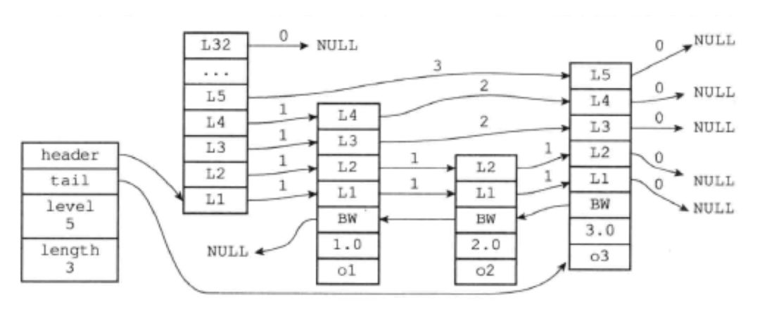 level:节点中用 L1、L2、L3 来标记节点的各个层,每个层都有两个属性:前进指针和跨度。前进指针用来访问表尾方向的其他节点,跨度记录了前进指针所指向节点和当前节点的距离(图中曲线上的数字)。level 数组可以包含多个元素,每个元素都有一个指向其他节点的指针,程序可以通过这些层来加快访问其他节点。层数越多,访问速度就越快。每创建一个新节点的时候,根据幂次定律(越大的数出现的概率越小)随机生成一个介于 1-32 之间的值作为 level 数组的大小。这个大小就是层的高度。跨度用来计算排位(rank):在查找某个节点的过程中,将沿途访问过的所有层的跨度累计起来,得到就是目标节点的排位。后退指针:BW,指向位于当前节点的前一个节点。只能回退到前一个节点,不可跳跃。分值(score):节点中的 1.0/2.0/3.0 保存的分值,节点按照各自保存的分值从小到大排列。节点的分值可以相同。成员对象(obj):节点中的 o1/o2/o3。它指向一个字符串对象,字符串对象保存着一个 SDS 值。