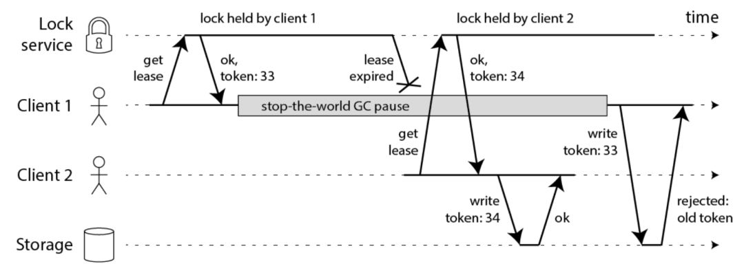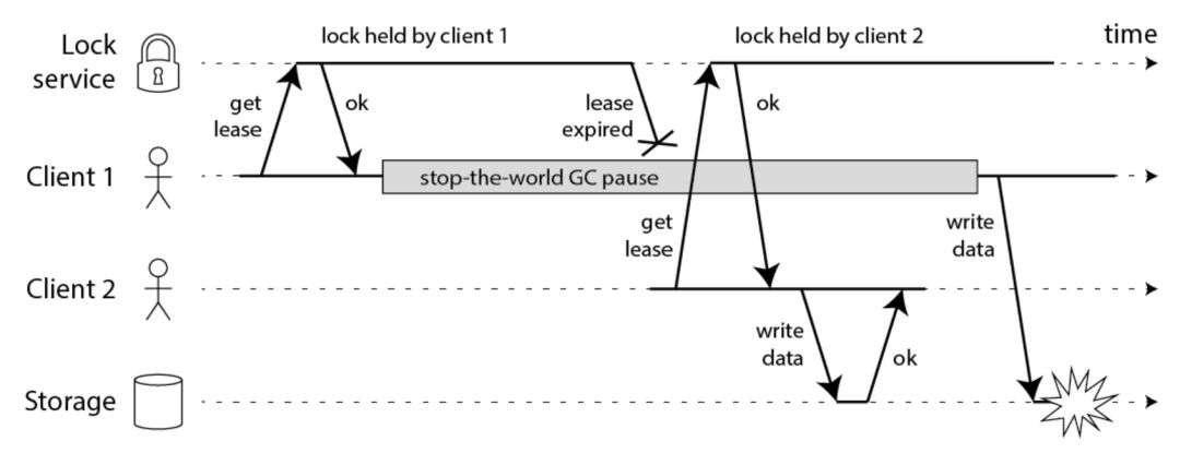 上述图中,得到锁的 client1 在持有锁的期间 pause 了一段时间,例如 GC 停顿。锁有过期时间(一般叫租约,为了防止某个 client 崩溃之后一直占有锁),但是如果 GC 停顿太长超过了锁租约时间,此时锁已经被另一个 client2 所得到,原先的 client1 还没有感知到锁过期,那么奇怪的结果就会发生,曾经 HBase 就发生过这种 Bug。即使你在 client1 写回之前检查一下锁是否过期也无助于解决这个问题,因为 GC 可能在任何时候发生,即使是你非常不便的时候(在最后的检查与写操作期间)。如果你认为自己的程序不会有长时间的 GC 停顿,还有其他原因会导致你的进程 pause。例如进程可能读取尚未进入内存的数据,所以它得到一个 page fault 并且等待 page 被加载进缓存;还有可能你依赖于网络服务;或者其他进程占用 CPU;或者其他人意外发生 SIGSTOP 等。