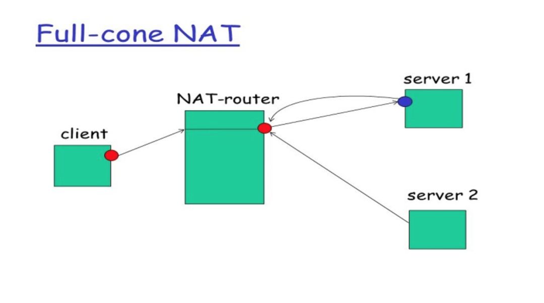 Full cone NAT(即一对一 NAT): 一旦一个内部地址(iAddr:iPort)映射到外部地址(eAddr:ePort),所有发自(iAddr:iPort)的包都经由(eAddr:ePort)向外发送。任意外部主机都能通过给(eAddr:ePort)发包到达(iAddr:iPort)。