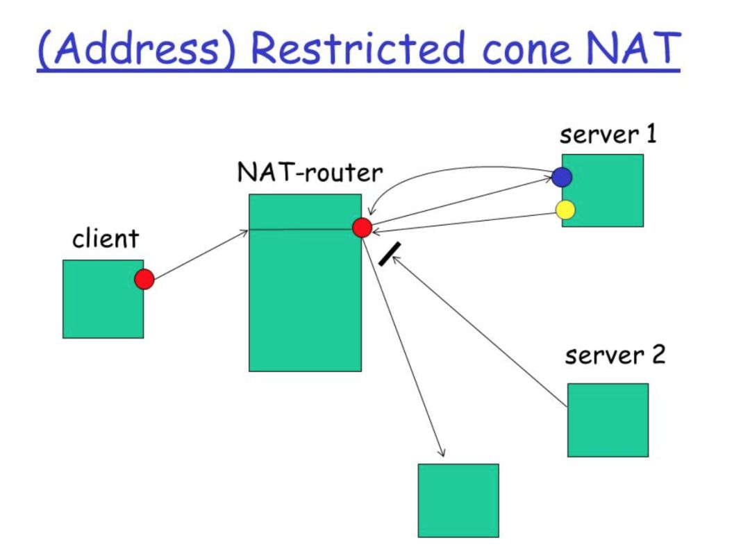 Address-Restricted cone NAT:内部客户端必须首先发送数据包到对方(IP=X.X.X.X),然后才能接收来自(IP=X.X.X.X)的数据包。在限制方面,唯一的要求是数据包是来自(IP=X.X.X.X)。内部地址(iAddr:iPort)映射到外部地址(eAddr:ePort),所有发自(iAddr:iPort)的包都经由(eAddr:ePort)向外发送。外部主机(hostAddr:any)能通过给(eAddr:ePort)发包到达(iAddr:iPort)。注:any 指外部主机源端口不受限制,只有发给 NAT 转换地址(eAddr:ePort)的数据包才被放行