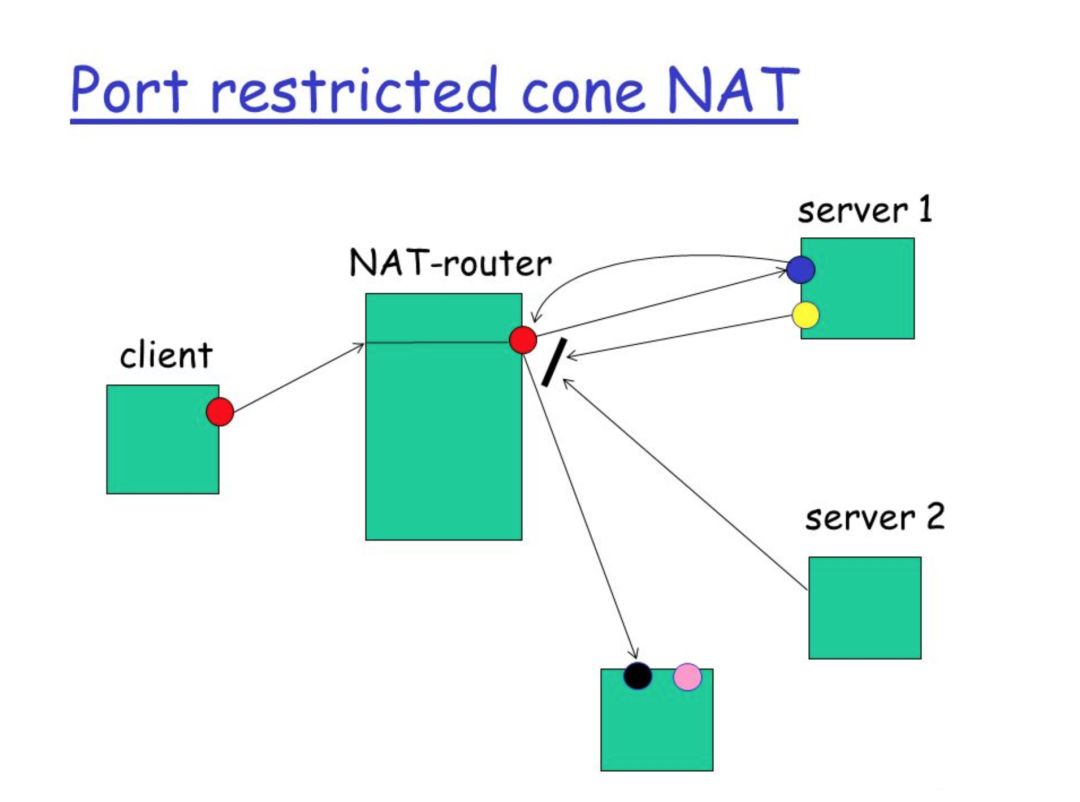 Port-Restricted cone NAT:类似受限制锥形 NAT(Restricted cone NAT),但是还有端口限制。一旦一个内部地址(iAddr:iPort)映射到外部地址(eAddr:ePort),所有发自(iAddr:iPort)的包都经由(eAddr:ePort)向外发送。在受限圆锥型 NAT 基础上增加了外部主机源端口必须是固定的。