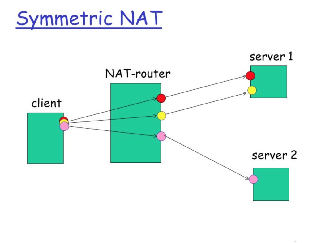 Symmetric NAT:每一个来自相同内部 IP 与端口,到一个特定目的地地址和端口的请求,都映射到一个独特的外部 IP 地址和端口。同一内部 IP 与端口发到不同的目的地和端口的信息包,都使用不同的映射。只有曾经收到过内部主机数据的外部主机,才能够把数据包发回。