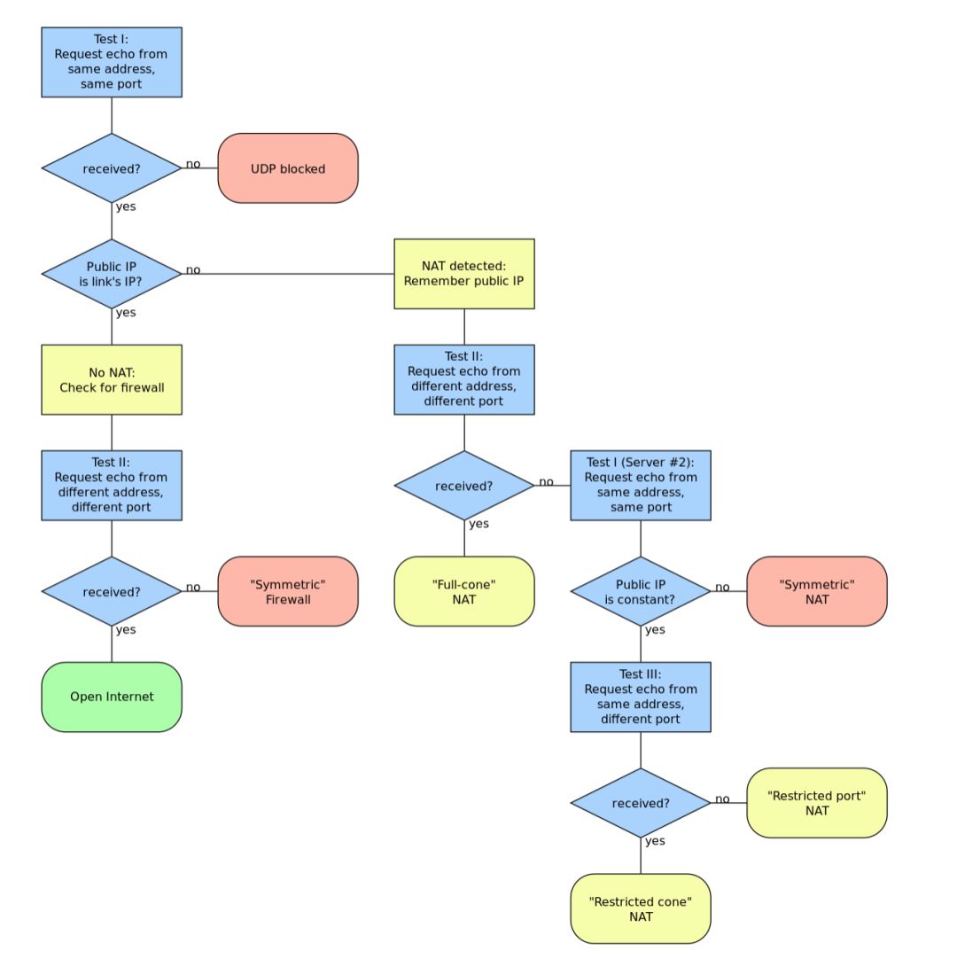 STUN(Session Traversal Utilities for NAT,NAT 会话穿越应用程序)是一种网络协议,它允许位于 NAT(或多重 NAT)后的客户端找出自己的公网地址,查出自己位于哪种类型的 NAT 之后以及 NAT 为某一个本地端口所绑定的 Internet 端端口。这些信息被用来在两个同时处于 NAT 路由器之后的主机之间创建 UDP 通信。是不是感觉 STUN 干的活儿非常熟悉,没错,STUN 负责的就是前面提到的 Server1 所做的内容。只不过 STUN 协议还具备另一个关键功能,就是确认 Client 的 NAT 类型(网络类型)。至于 STUN 是怎么获取 Client 公网地址这部分内容,我就不赘述了。接下来我会介绍一下 STUN 是如何确定 Client 的 NAT 类型(网络类型)的。
