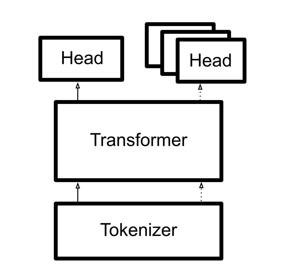 tokenizer 用于将原始的text转为离散的token ids。 transformer将token ids转为包含上下文信息的embeddings head 用transformer得到的embeddings做特定任务的prediction