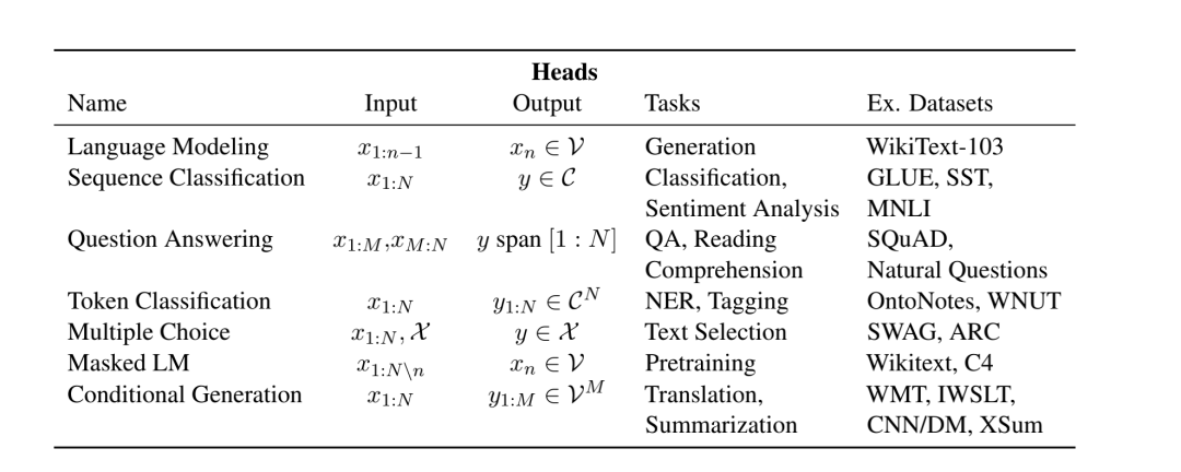 不同的head对应不同的NLP任务。下图中列出7种常用的head。