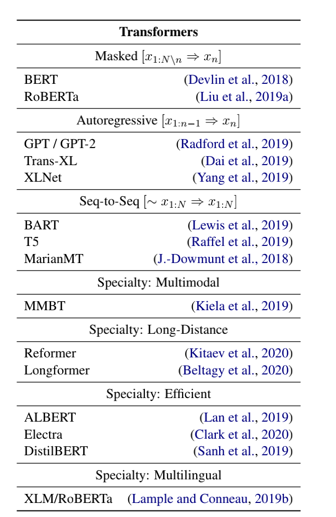 bert以后,各种改进款不断涌现,每种改进款,都着眼于一个方面,有的关注长序列,有的关注计算效率。下图是transformers中实现的不同变种: