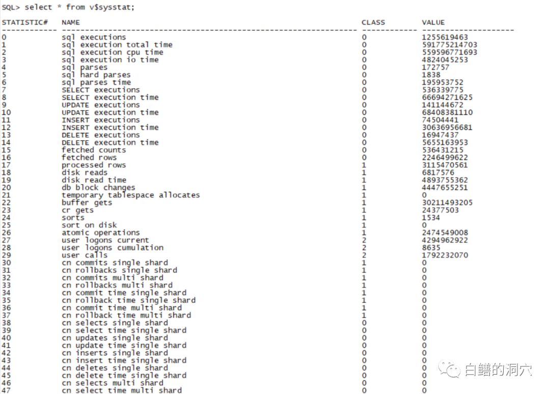 不仅SQL能跑,查询出来的结果也让我这个Oracle DBA感觉十分舒坦,不需要太多的学习就可以掌握了。当然V$SYSSTAT也是必须有的: