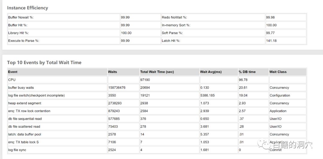 我们没有做太多的调整,就跑了一下TPCC测试,在这台2路36 C/64G的服务器上,跑到将近100W TPMC,还算不错吧。单进程的数据库内存很重要,如果内存扩到256G,再优化一下,应该跑到150W没啥问题。这时候的等待事件是这样的: