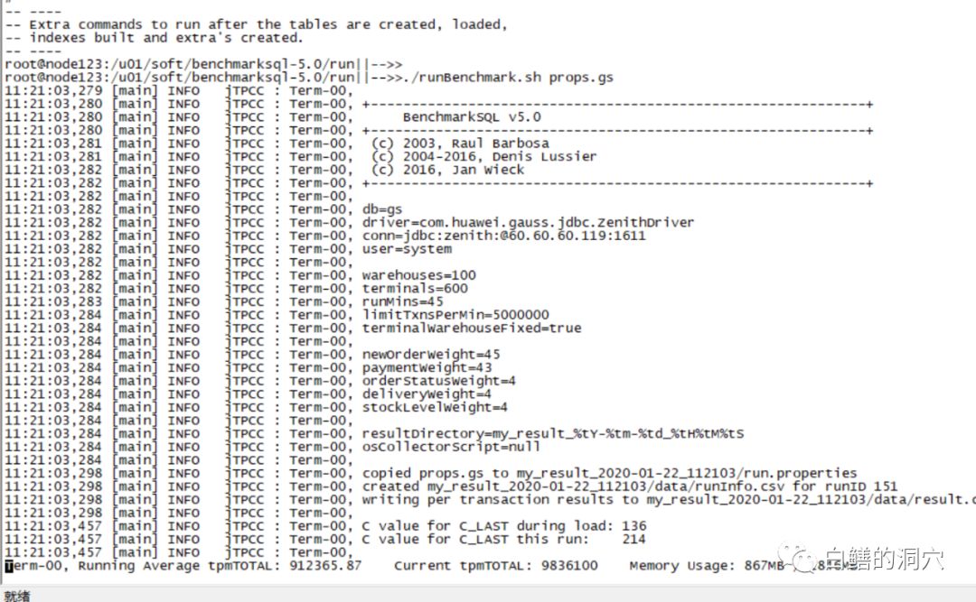 由于高斯100和Oracle十分类似,所以我们把benchmark的Oracle配置文件稍微改一下,就可以让benchmark支持Oracle了。首先创建一个100个仓库的测试环境,然后开始benchmark压测。