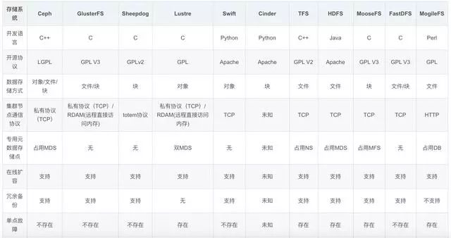 Ceph,GlusterFS,Sheepdog,Lustre,Swift,Cinder,TFS,HDFS,MooseFS,FastDFS,MogileFS等