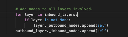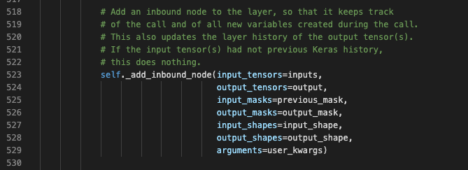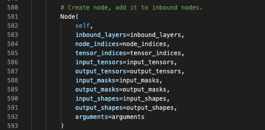 这里是创建了Node,之前已经看过,在创建Node时,会把该node加到input layer的outbound_nodes数组中,同时加入该layer的inbound_nodes数组中。
