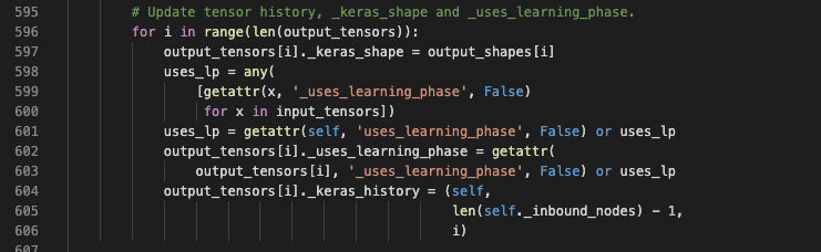 确定每个output tensor的 _uses_learning_phase时有三个考虑,一个就是该tensor自己的_uses_learning_phase属性,另一个就是产生该tensor的layer的_uses_learning_phase属性,另一个就是所有的input tensor的_uses_learning_phase属性。代码中已经明示了。