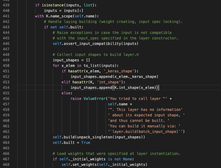 build完之后,初始化了weights,并再次检查了input shape,因为在build方法中,可能会创建input_spec。这些我们都比较熟悉了。