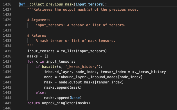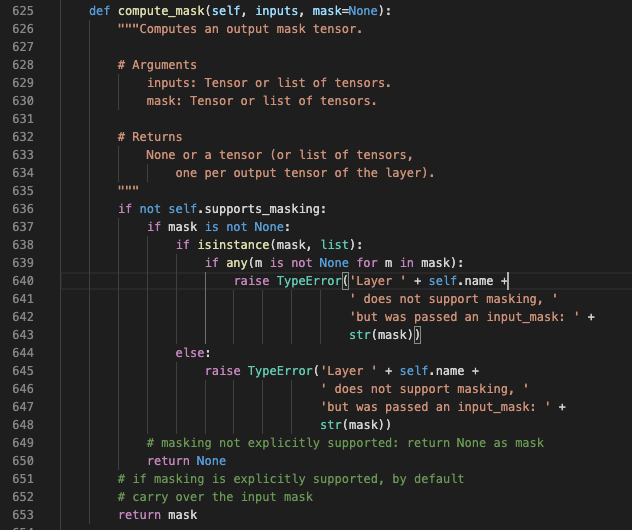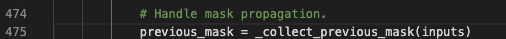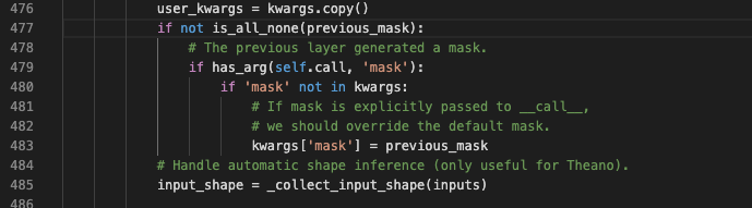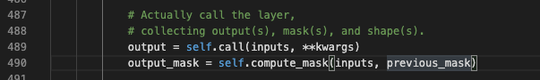 这里看到,收集了mask信息后,添加到kwargs中,当然,如果你明确传入了mask,就不会用收集到的mask更新。前提是,你的call方法中还要有mask这个参数。这个参数表明了你的layer是support_mask的。