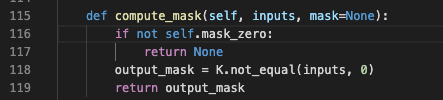 这里的mask就是简单传递一下。为了找到一个具体例子,我想起来了Embedding这个layer,找到里面的方法: