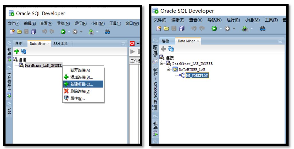 打开DataMiner TAB新建连接,选择刚刚建立的Oracle云数据库连接,首次连接时按照系统提示创建DataMiner资料库,注意在界面上选择“创建示例数据”。