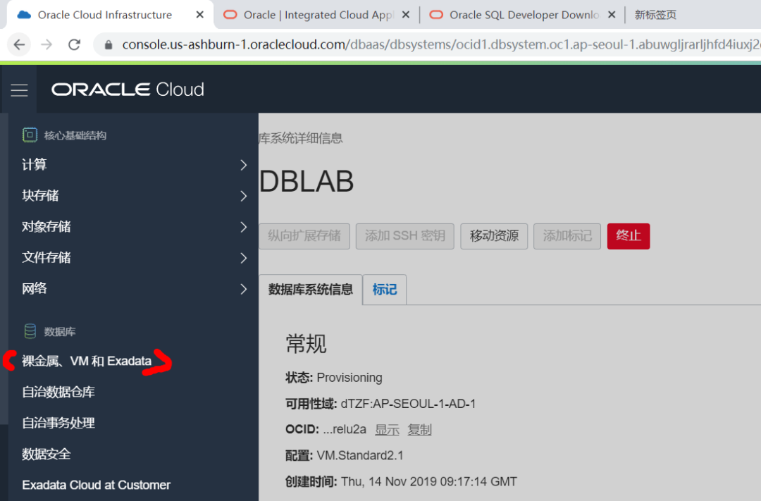 Oracle Advanced Analytics可以在云上或云下环境中部署的Oracle数据库中使用,本例中选择公有云服务作为部署平台。登陆甲骨文云平台,选择“数据库->裸金属\VM和Exadata”, 按照指引创建数据库服务。