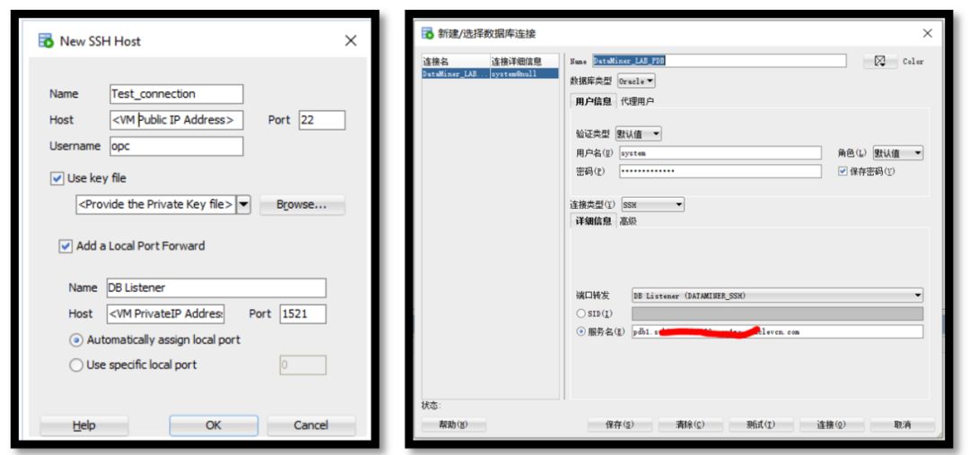 接下来使用SQL Developer通过SSH tunnel方式连接Oracle公有云数据库,建立SSH tunnel需要准备:Oracle数据库云服务的Public IP、Private IP、云服务对应的SSH密钥等, SSH tunnel创建完成后在SQL Developer中使用拥有DBA权限的用户连接云数据库。