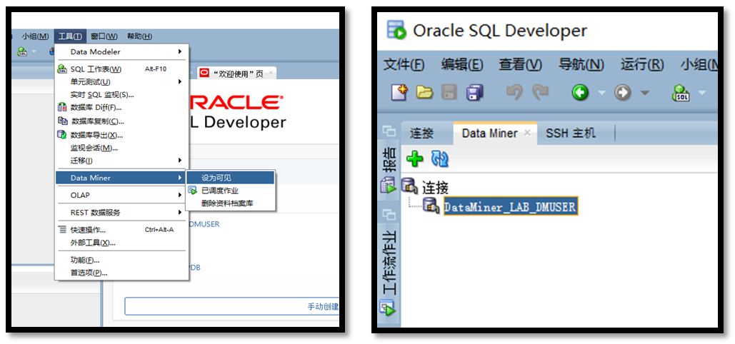 在SQL Developer中选择“工具->Data Miner->设为可见“,在界面中打开Data Miner TAB。