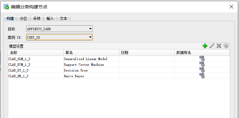 如图所示,Oracle Data Miner在【分类】组件中提供了通用线性模型、支持向量机、决策树、单纯贝叶斯等四种算法,用户可以选择删除其中不想采用的算法。
