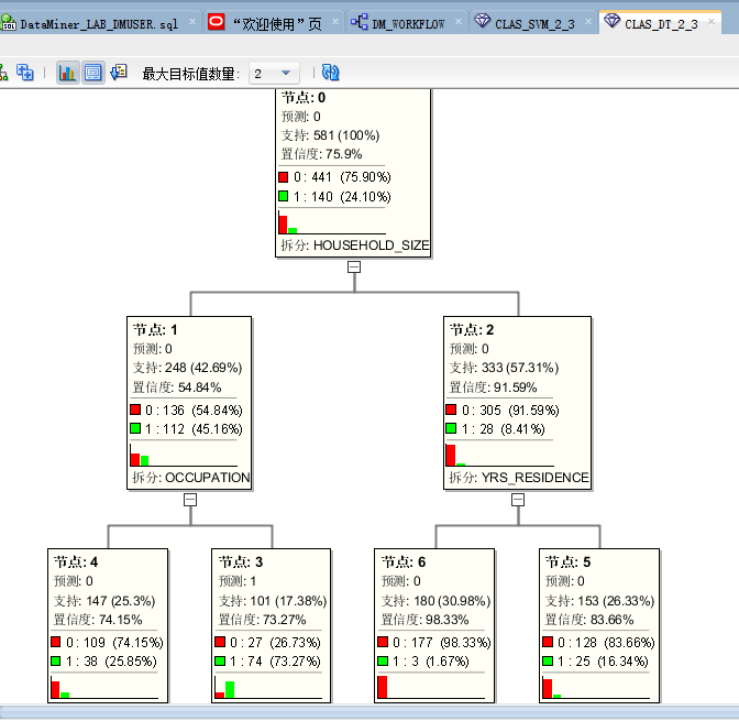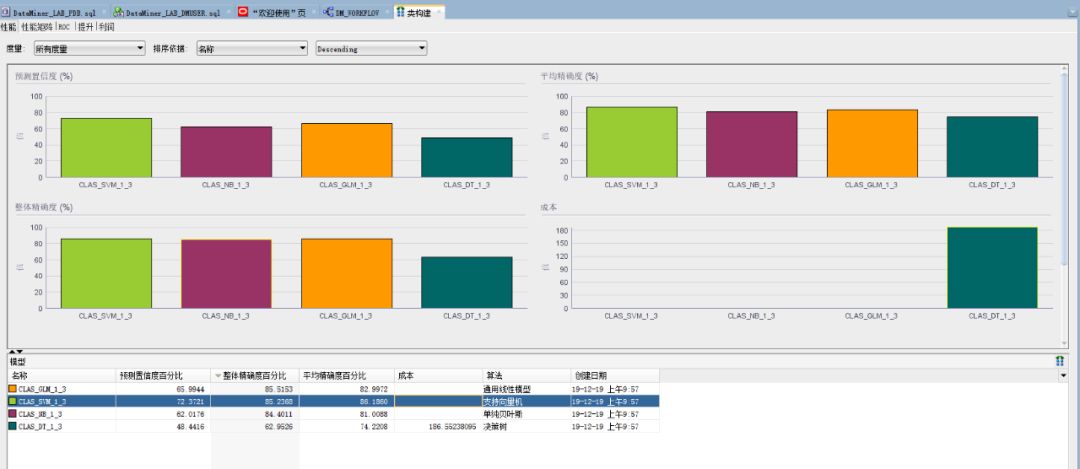 如图所示DataMiner提供了置信度、精确度等多个模型评估维度。DataMiner还能详细检查生成的各个模型,在【类构件】组件上右键点击【查看模型】,再从四个生成的分类模型中选择自己关心的模型进行详细检查。以下为【支持向量机】和【决策树】类模型的详细检查界面截图。