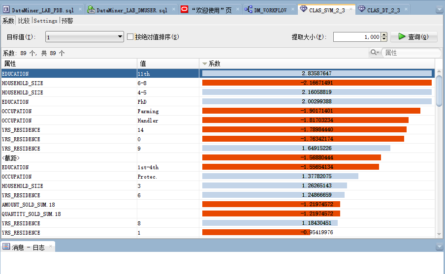 接着添加【创建表或视图】组件,将初步处理后的JSON数据存入数据库中的中间表内,为后续的数据分析做准备。添加【类构建】组件,使用处理后的数据进行模型训练。选定AFFINITY_CARD作为目标值,选择CUST_ID作为案例ID。