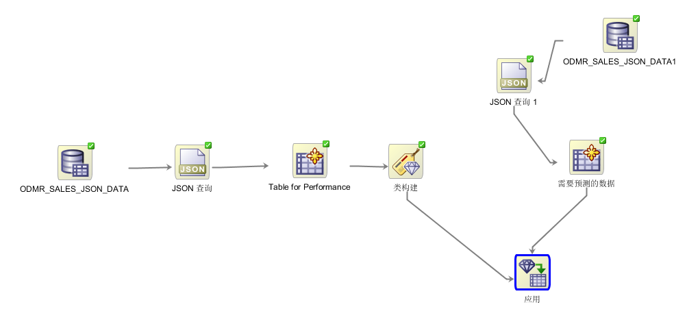 现在,既然我们已经有了模型,接下来即可将模型应用到数据的预测中。在工作流中增加需要被预测的数据(添加【数据源】组件以及【JSON查询】等格式转化组件)和模型应用动作(模型操作->【应用】组件)设置完毕后整体工作流图如下: