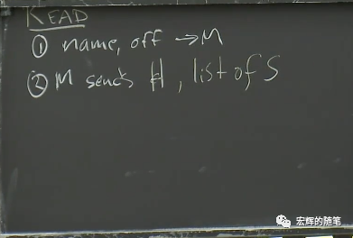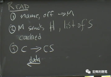 对于读请求来说,意味着应用程序或者GFS客户端有一个文件名和它想从文件的某个位置读取的偏移量(offset),应用程序会将这些信息发送给Master节点。Master节点会从自己的file表单中查询文件名,得到Chunk ID的数组。因为每个Chunk是64MB,所以偏移量除以64MB就可以从数组中得到对应的Chunk ID。之后Master再从Chunk表单中找到存有Chunk的服务器列表,并将列表返回给客户端。所以,第一步是客户端(或者应用程序)将文件名和偏移量发送给Master。第二步,Master节点将Chunk Handle(也就是ID,记为H)和服务器列表发送给客户端。