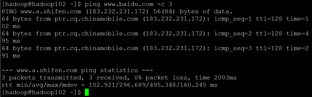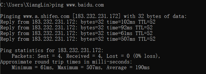 -n :发送count指定的ECHO数据包数。通过这个命令可以自己定义发送的个数,对衡量网络速度很有帮助。能够测试发送数据包的返回平均时间,及时间的快慢程度。默认值为 4。