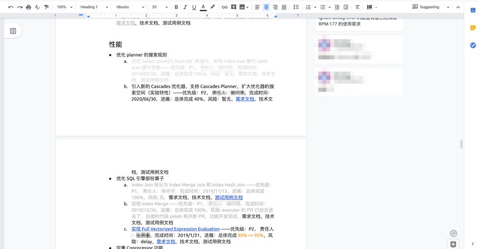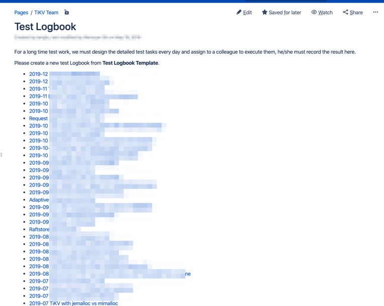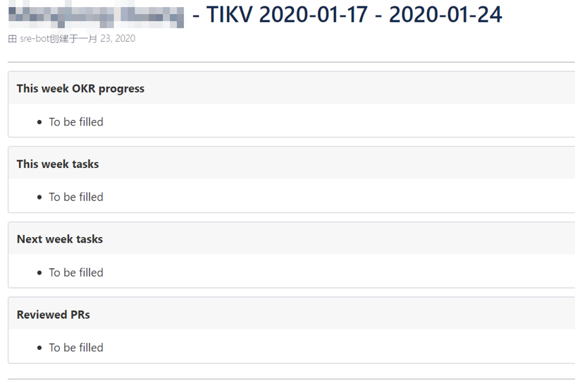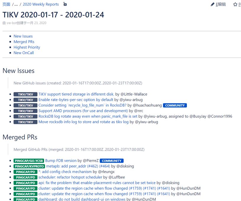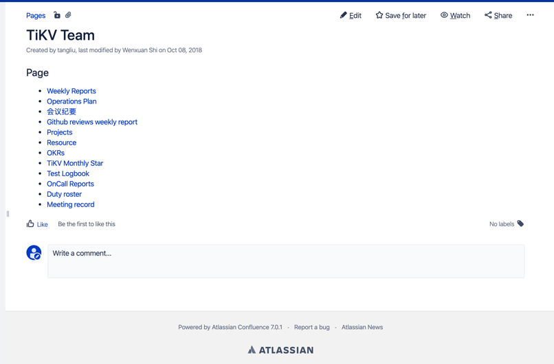 在聊我们的沟通实践之前,我想先聊聊沟通的意义,首先我认为沟通最重要的意义在于:信息拉平。对于一个远程的团队来说,用大白话来说也就是:大家需要互相都知道自己该干嘛,团队正在干嘛以及该干嘛。这件事情在很多公司是通过大大小小的会议,或者甚至吼一嗓子完成的。但是在一个远程的团队中,沟通这件事情需要做得更加的透明。即使是远程,大部分时候会议仍然是最高效的信息拉平方式,类似 Zoom 这样的视频会议工具已经提供了很好的平台,而且智能手机和移动互联网的普及也让会议的参与变得更加的便捷。这里多提一句,PingCAP 是 Zoom 的重度用户(也是企业客户),Zoom 的用户体验真的非常棒,我们即使是全公司级别的会议,也都是通过 Zoom 完成的(昨天刚得知一个令人振奋的消息,也给 Zoom 做个友情广告,目前国内用户访问 zoom.com.cn 可以免费不限时长使用,直到疫情得到有效控制之日)。在 PingCAP 从形式上来说,因为会议基本都会有远程的同学参与,所以默认都是线上会议。从内容上来说,大概有两种会议,一种是例会,一种是具体业务的沟通会。相信和别的公司也没什么不一样,我这里聊聊我们觉得比较好的一些实践:在 PingCAP 各个团队(包括虚拟团队)大大小小一定都会有例会,通常以周为单位,有些比较重要且紧急的项目会以天为单位,会议的时间和长度也不一定。周会是一个很好的机会能让团队成员互相了解大家在干嘛,对于 Manager 也能很好的知道方向有没有歪,进度是否正常。1. 对于类似例会这种偏信息拉平的会议,Manager 最好不要直接在这类会议上做决策。因为很多信息可能是刚接收到马上做决策不一定是经过深刻的思考,另一方面信息可能不全面,还需要进一步的跨团队沟通。2. 善用 Calendar。我建议研发团队内部将 Calendar 可以别人可见(这点上财务,商务,高管团队需要酌情考虑),通过订阅和你相关的同事的 Calendar 是一个也是一个很好的信息拉平渠道。3. 会议前发 Agenda,会议后形成 Meeting notes 发给参会的人,并记录在 Wiki 中。4. 尽量少开大会长会。Amazon 的「两个 Pizza 原则」也同样适应于开会(这点说起来简单,其实做起来很困难,尤其在跨团队协作上,我们也在努力)。这里说几个我们亲身经历的坑。因为远程的关系,在 PingCAP 我们一直以来要求尽可能的使用文档进行沟通,我们确实在早期很严格的践行了,但是那个时候我们重度依赖在线文档,于是陷入了一个问题:协同功能很棒, 但是索引功能很弱。于是很多时候就出现了,可能记录某件事情的文档找不到了,或者有多个文档(很多甚至只是讨论稿)在描述同一个事情。为了解决这个问题,我们后来引入了 Confluence,用做团队 Wiki,主要起到信息索引和搜索的功能,我们非常依赖 Confluence,并且玩出了很多花样,这里我只举几个最佳实践的例子:1. 给每个团队创建团队的 Page(类似前面提到的「地图」的概念)索引一切和这个团队相关的内容,让新人能够一目了然。例如下面是来自 TiKV 团队的例子:2. 团队周报和个人周报,每个团队的周报会一层层的汇总和归纳,在每周的高管例会前发出。所有的周报都在 Confluence 里被索引。3. Logbook,这个是我们比较有意思的东西,对于一些带有探索性质的工作,例如一些小实验,性能测试,一些特殊场景的优化等等。我们也会详细的记录下来,形成一个个实验 logbook,这些 logbooks 可以通过关键字被 Confluence 的检索到,一是作为未来实现或者输出成文章的素材,二是防止将来做重复的工作。在内部协作全面引入 Confluence 后,我们的文档信息碎片的问题得到了比较大的缓解,唯一美中不足的是 Confluence 的移动端做得实在不尽如人意,希望 Atlassian 团队未来能改进。 另一个坑来自于 IM 工具的选择。这个可能也不是坑,更多的是由于微信平台本身不是为了办公场景设计的带来的问题。由于我们多数的国内客户都倾向于使用微信作为沟通的渠道,作为一个 toB 企业,我们必须去适应这个现实(比如我手机上有几千个微信群),这个问题导致了我们 IM 沟通的碎片化,而远程工作的环境会进一步放大这个问题。可能同一件事情,有些同学看着微信,有些同学看着 Slack,这就导致了消息不对称。再者微信是一个封闭系统,没有 Open API,很难通过技术的手段同步到一个平台。另一个问题是,微信这种用法,工作和生活很难分开,有时候很令人苦恼。这个问题通过引入企业微信得到了一定的缓解,但是因为企业微信又是一个新的 IM,也是一个封闭系统,信息碎片化的问题和海外同事使用习惯上的问题仍然存在。在这个方面,我们仍然在探索。远程办公还有一个很重要的方面是个人的心理建设和自我管理。这点因人而异,其实很多人不太适合长期 work from home,例如我远程工作的时候一定要从家走出来,去个咖啡厅或者 WeWork 之类的地方才能进入工作状态,但是我们的首席架构师就可以五年如一日将他家的书房当成办公室。人无疑是最重要的一环,不过在这篇文章中,我并不想展开太多,有机会再详细聊聊,这篇文章我希望尽量关注比较普适的方法。在远程环境下,需要工作者能够克服孤独感,并且由于没有同事在身边,需要比较强大的自律精神克服倦怠感。在这点上,我推荐使用一些个人时间管理工具,例如番茄钟,日历等工具。但是和公司选用工具一样,切忌贪多,选择一个用透最好。另外在生活中也保持一个规律的作息