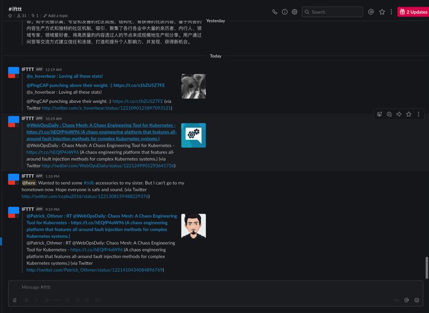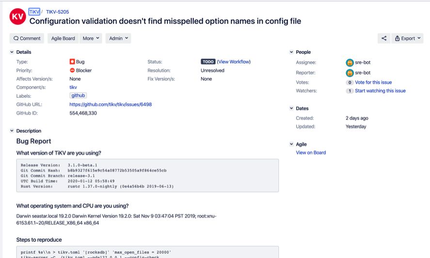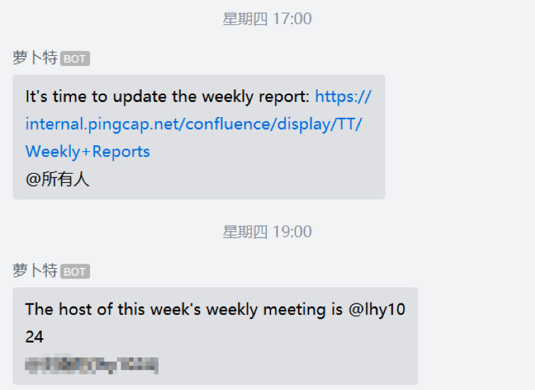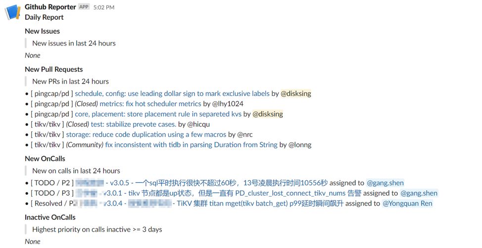 1. 假设我们需要做一个新功能,从构思开始,可能第一个会使用的工具是在线文档,负责的同事会草拟一个文档,将大致的想法在其中描述,然后通过 Share 的功能,分享给相关的同事,大多数时候这些设计文档都会 share 到所有的工程师都会在的邮件组里,任何人都可以上去评论或者编辑。2. 文档经过沟通讨论定稿之后(沟通环节我会在下面一节重点介绍),会同步到 Confluence 和 GitHub 中(如果可以公开的话,英文版会发到 GitHub 上)。3. 接着该项目将被拆分成多个子项目,通过 JIRA 分配到具体的人,完成后直接提交到 GitHub 上,项目的该模块的 Reviewer(也包括 Maintainer)会参与 Code Review,收集到两个 LGTM(Looks good to me) 并通过各种持续集成工具的测试后,最终合并到主干。修 Bug 的流程也类似,值得一提的是我们开发了一个 bot,用于同步 GitHub 中来自社区的 Issue 到内部的 JIRA 中。优秀工程师的创造力是无穷的,尤其在远程工作的背景下,我们非常鼓励工程师通过自制工具来提升工作的效率。除了上面提到的 Issue 机器人,我们的 Chaos 测试(最近已经开源, https://github.com/pingcap/chaos-mesh),CI/CD,甚至包括社交网络上简单的动态舆情监测,都有自动化的工具在做。还有小伙伴们通过自动化的手段优化自己工作中的一些流程,举几个好玩的例子:disksing 同学使用 App Script 自动生成自己的周报(http://disksing.com/review-recorder/);siddontang 同学自己写了个小工具 github-cli(https://github.com/siddontang/github-cli)来高效的追踪关注的 Github 项目的动态;我用 Python 写了一个小脚本,每日收集 Trello 上指定 Board 内的卡片的更新,并给我汇总发邮件……这样的例子数不胜数,有时候真是很佩服大家想象力和动手能力,我们非常坚定地鼓励大家做这些事情。我们的 IFTTT 机器人在收集提及 TiDB、PingCAP 的推文由我们的 bot 同步的 Github Issue每周周会之前自动生成的 Weekly ReportSRE 机器人自动 Merge PR 并 Cherry-pick 到 Release 分支介绍了这么多好玩的东西,其实我想表达的是:对于远程工作来说,能交给机器做的,尽量不要人来做,自动化是至关重要的。尤其对于线上的协作来说,多一个人的参与就意味着多一份沟通成本。我对于工程师团队选择开发相关的效率工具,有几个建议:1. 选择有开放 API 的工具,方便写 bot,形成协同效应。3. 使用 Slack 之类的 IM 作为各种工具的 Message Hub,尽可能做到在一个地方就能一目了然事情的状态。另外就像上面提到的,由于我们也有一些海外的同事、客户以及海外社区沟通的需求,所以主要选用的工具基本都是国际上比较通用的,如果你们公司的业务都在国内的话,这些工具基本都可以找到国内的或者私有部署的替代方案,例如 ONES,Tower,Gitlab 等。如果说上面聊的工具只是基础的话,那么远程工作最大的挑战就是沟通了。对于一个成熟的团队来说良好的沟通一定是必不可少的,甚至沟通的品质决定了做事情的品质。并不是说因为远程工作因为条件约束,就少沟通甚至不沟通了,相反的,在这种环境下我们的沟通可能会更多更细致,只是形式并不仅仅限于面对面的会议这种形式而已。