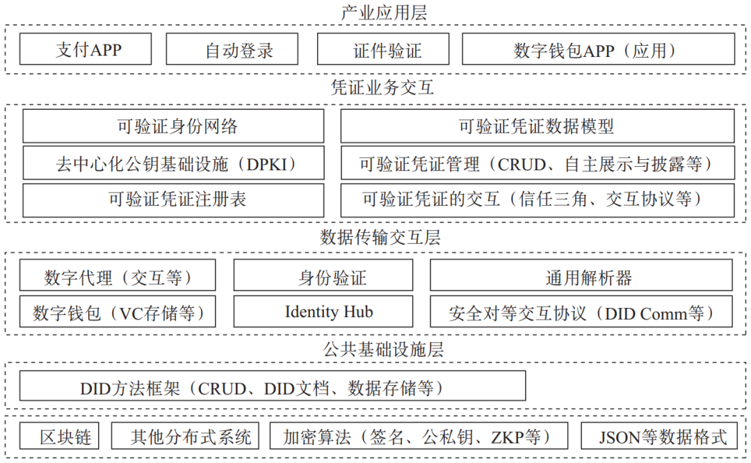 从业务逻辑和实现所需要的核心技术出发,可将分布式数字身份分为4层,整体架构如图1所示。
